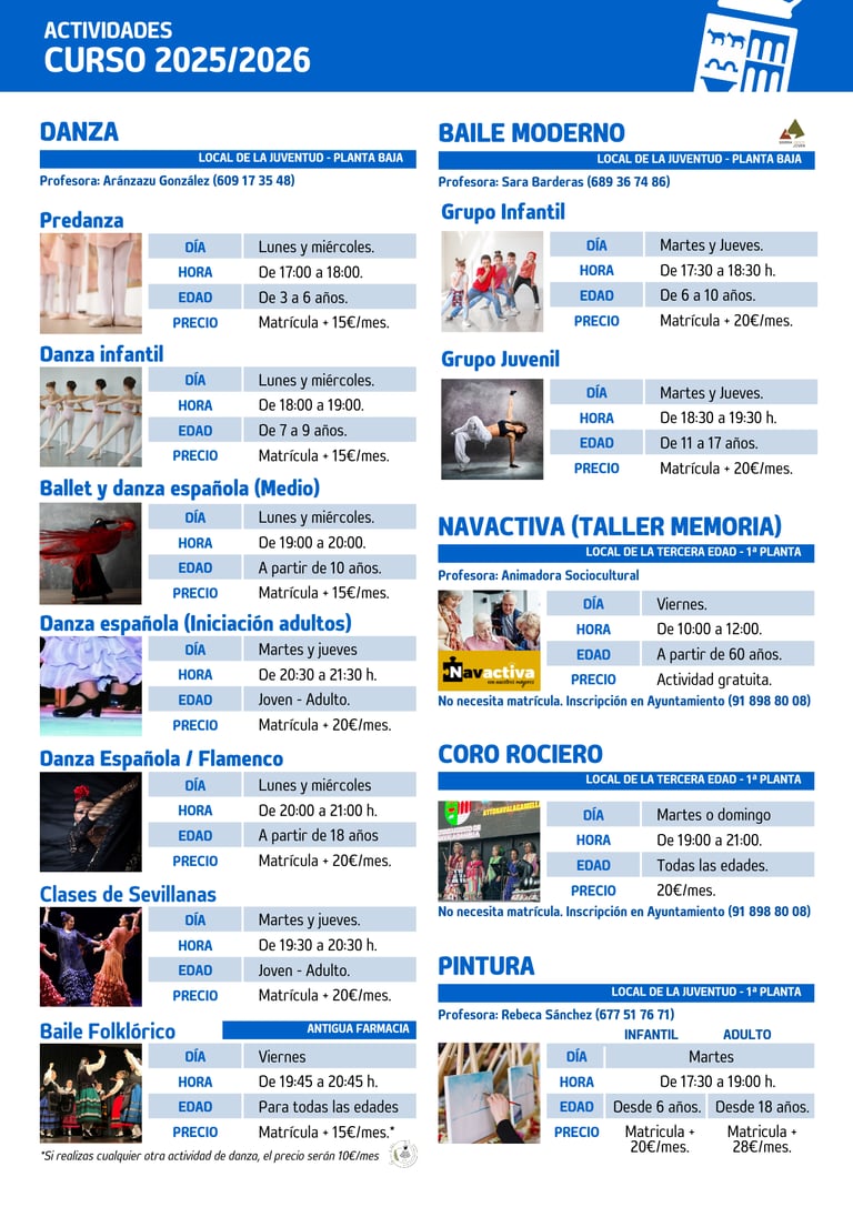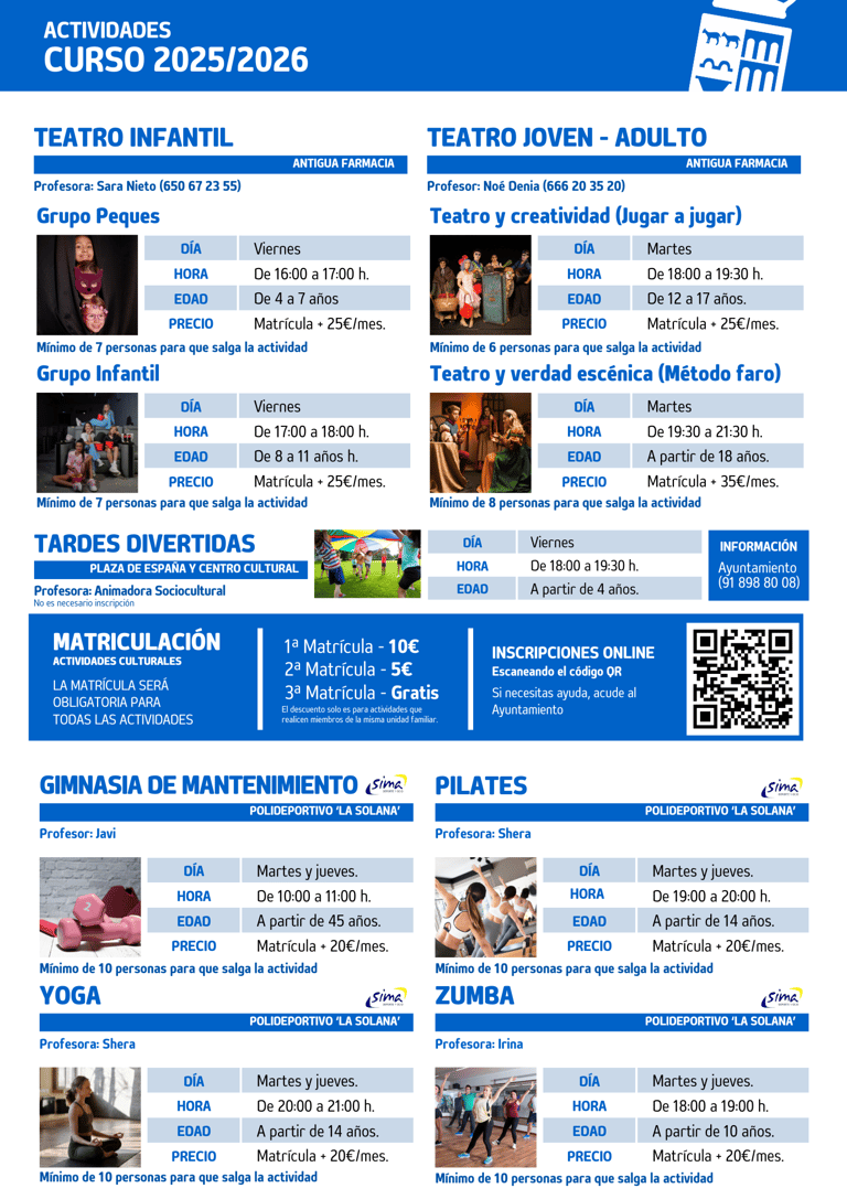 Actividades culturales: Inscripción online mediante formulario (https://forms.gle/q7x1MagoXLSYXBTf8). Si necesitas ayuda contacta con el Ayuntamiento (918 988 008).