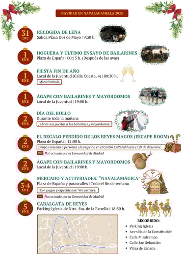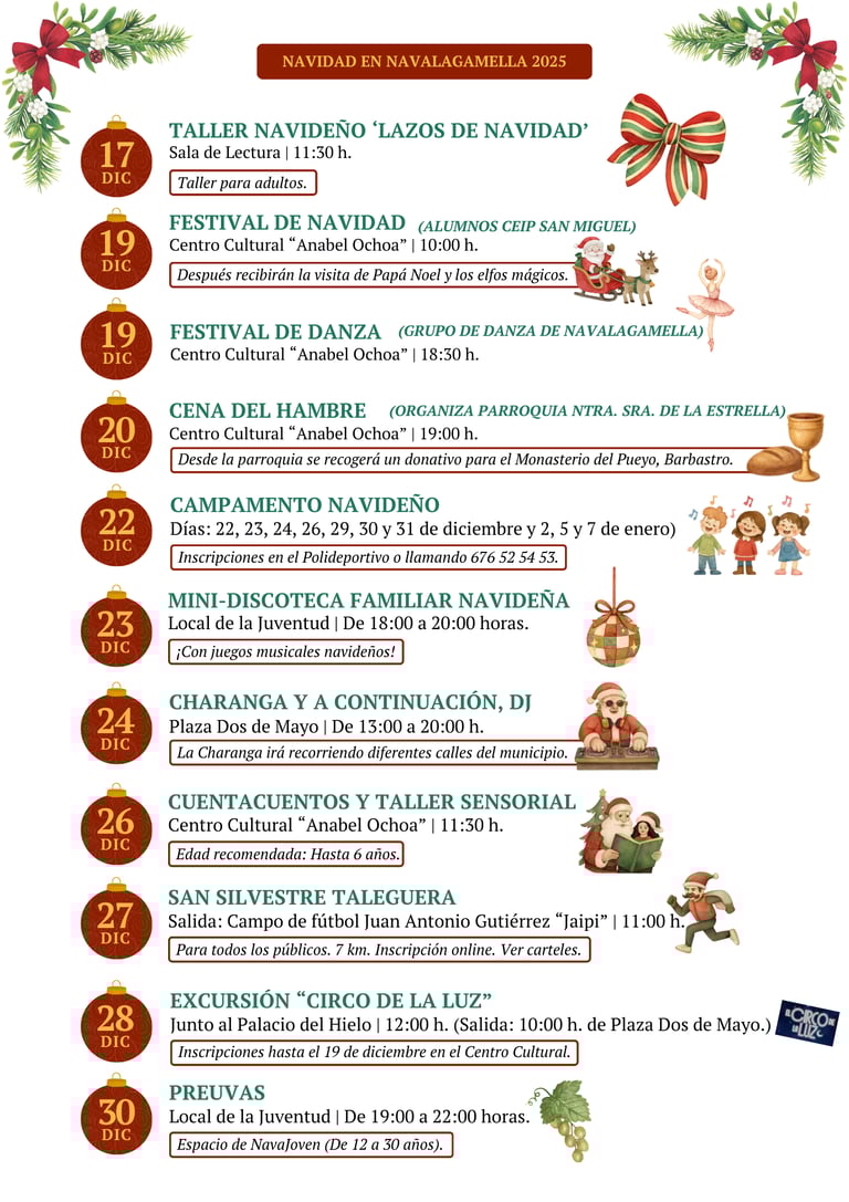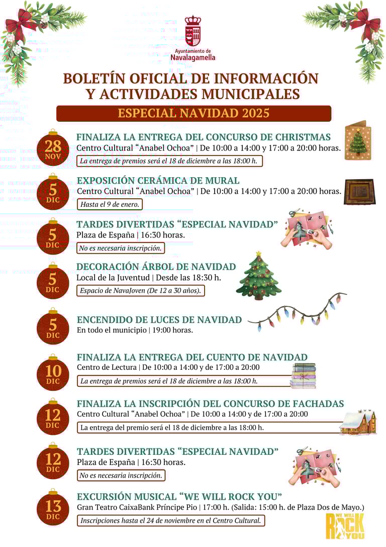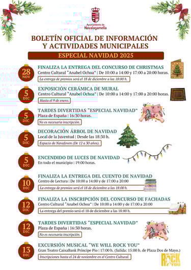 ¡Ya está aquí el Boletín de Actividades Navideñas de Navalagamella! Descubre y no te pierdas todas las actividades y eventos que el Ayuntamiento de Navalagamella ha preparado para disfrutar de estas fiestas: desde talleres y concursos hasta eventos culturales y deportivos para toda la familia.
