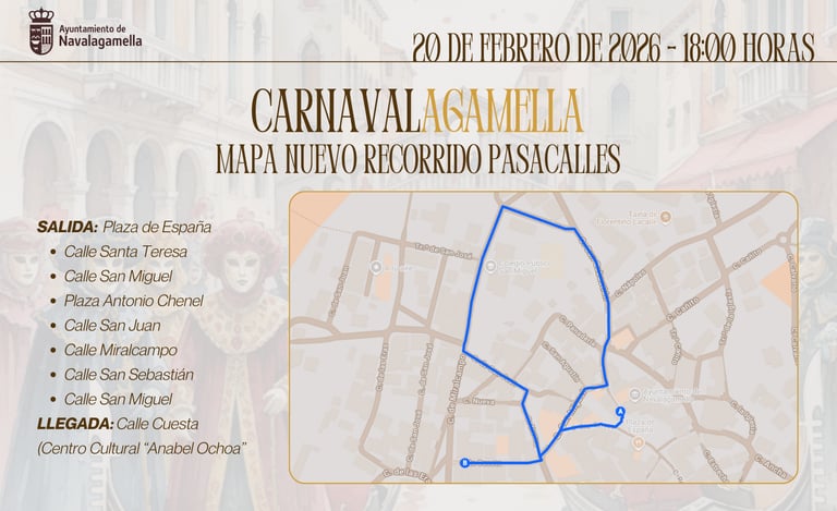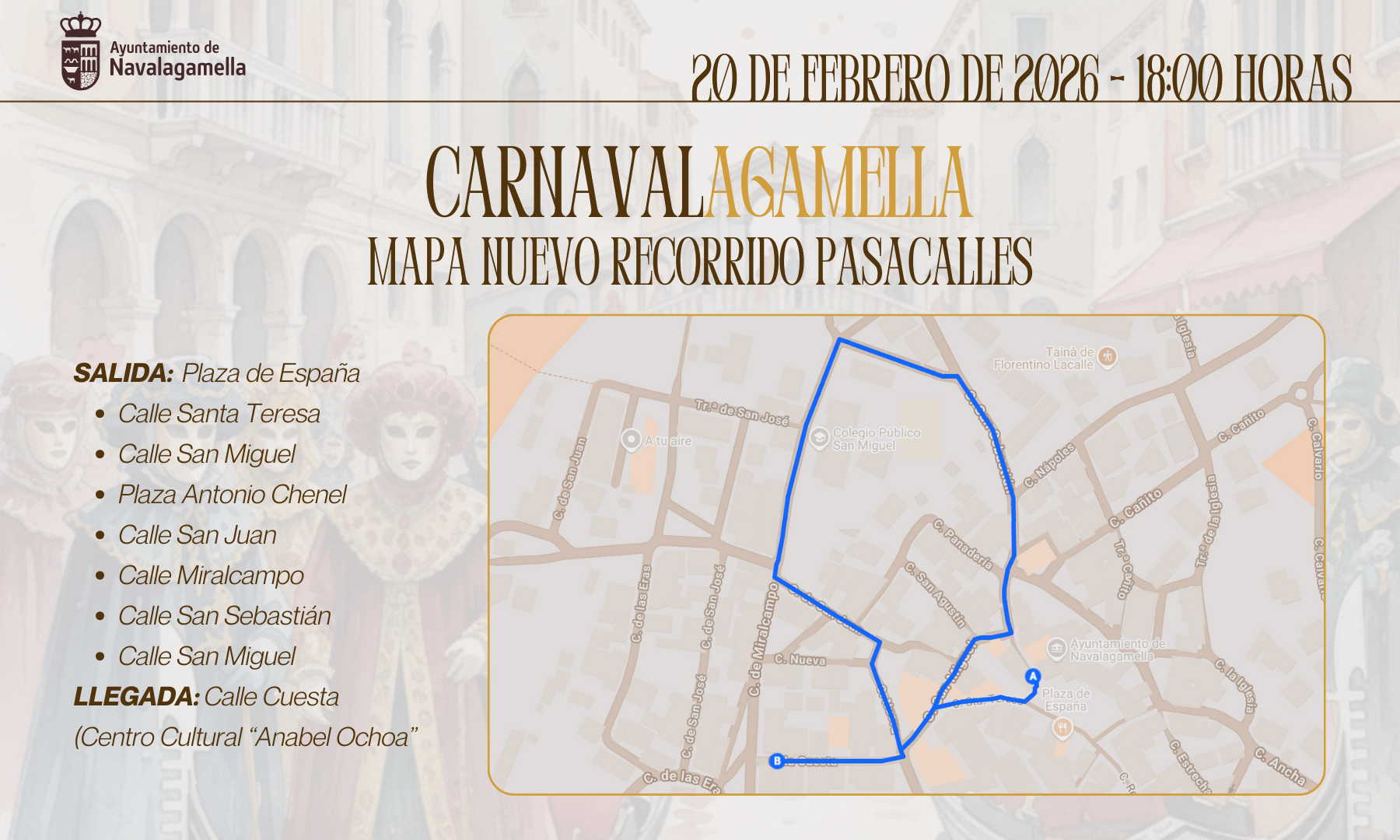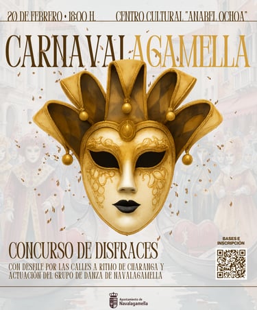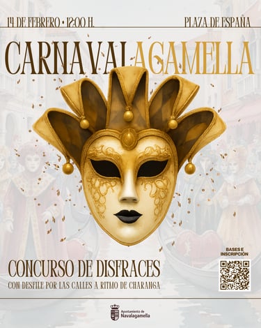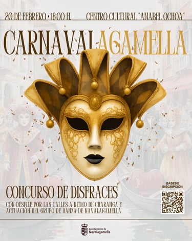 Se cambia el Concurso y el Desfile al viernes 20 de febrero celebramos el día central de las fiestas. A las 18:00 h., el Pasacalles saldrá de la Plaza de España hacia el Centro Cultural "Anabel Ochoa", donde tendrá lugar el Concurso de Disfraces. La música y el baile acompañarán este evento lleno de ingenio y originalidad, perfecto para disfrutar del espíritu carnavalero de Navalagamella en familia o con amigos.