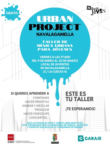 La Concejalía de Juventud del Ayuntamiento de Navalagamella, en colaboración con el programa Nava Joven, anuncia la puesta en marcha de "Urban Project Navalagamella", un emocionante taller de música urbana totalmente gratuito dirigido a jóvenes del municipio.