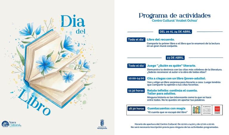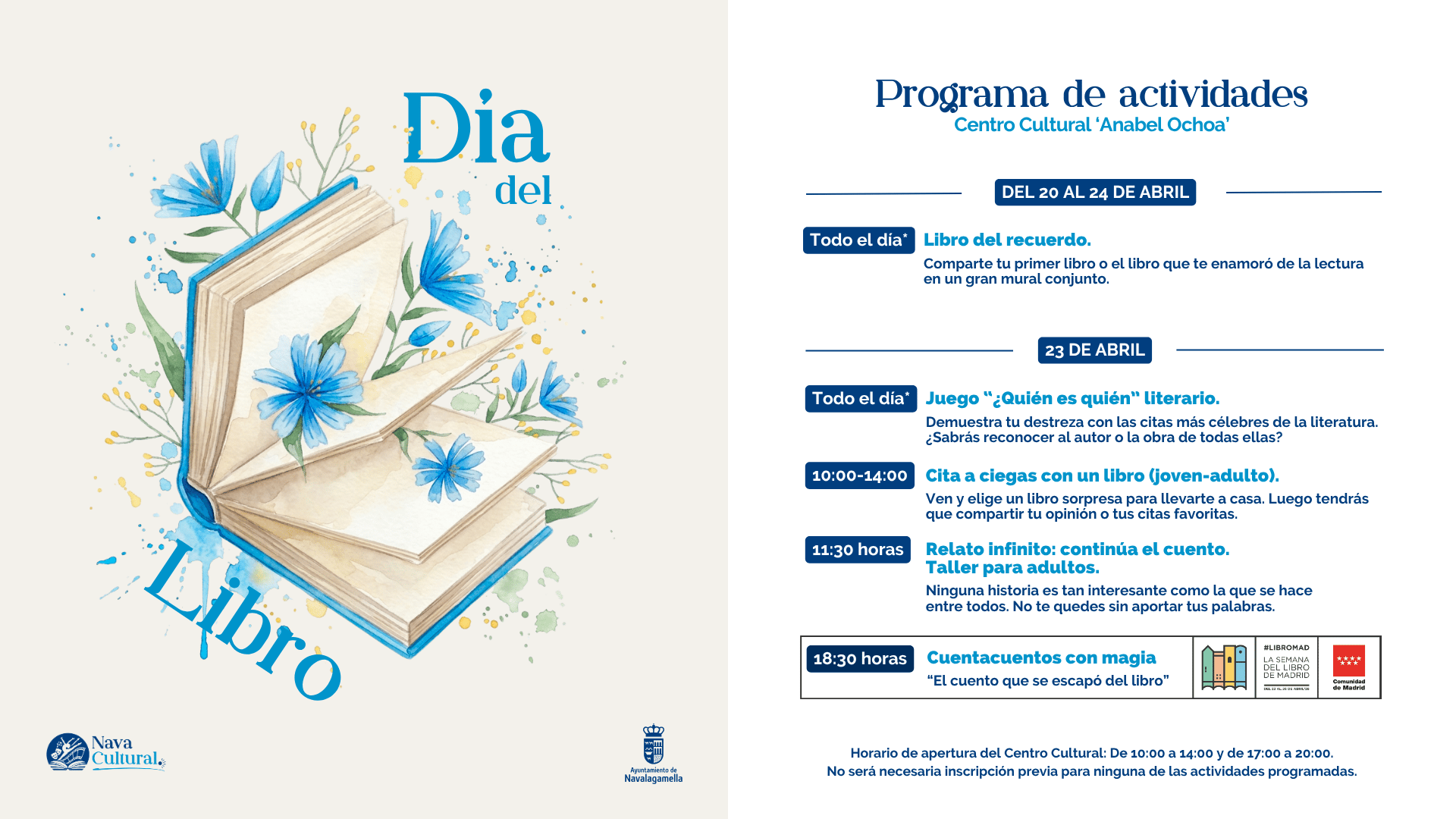 El próximo 23 de abril se conmemora el Día del Libro, una fecha emblemática para el fomento de la lectura, la cultura y la creatividad. Con este motivo, el Ayuntamiento de Navalagamella, a través de la Concejalía de Cultura, ha preparado un programa especial con propuestas pensadas para que vecinos y vecinas de todas las edades puedan participar, disfrutar y acercarse aún más al mundo de los libros.