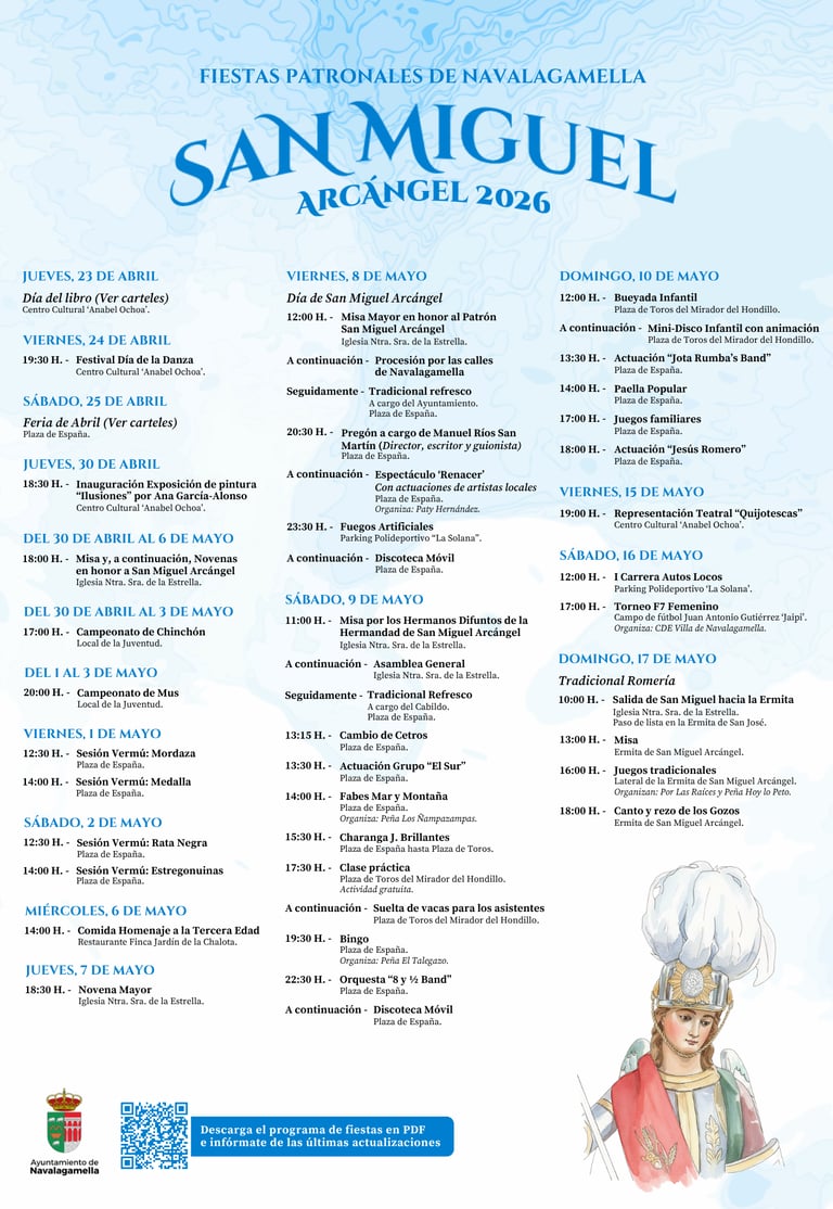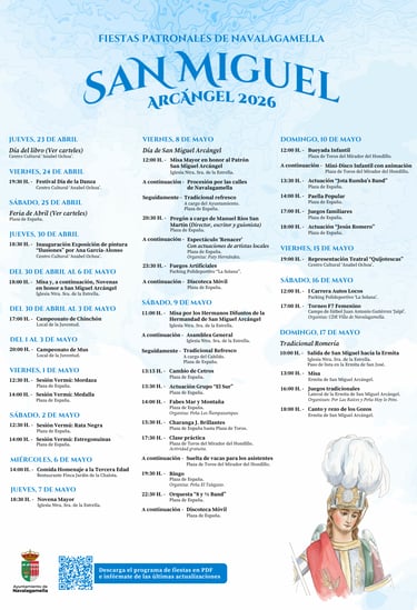 Navalagamella se prepara para vivir sus esperadas Fiestas Patronales en honor a San Miguel Arcángel, que se celebrarán del 23 de abril al 17 de mayo. Unos días llenos de actividades culturales, lúdicas, religiosas y tradicionales para disfrutar en familia, con amigos, vecinos y visitantes.
