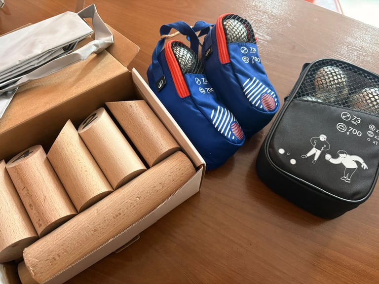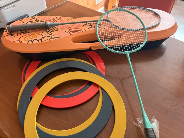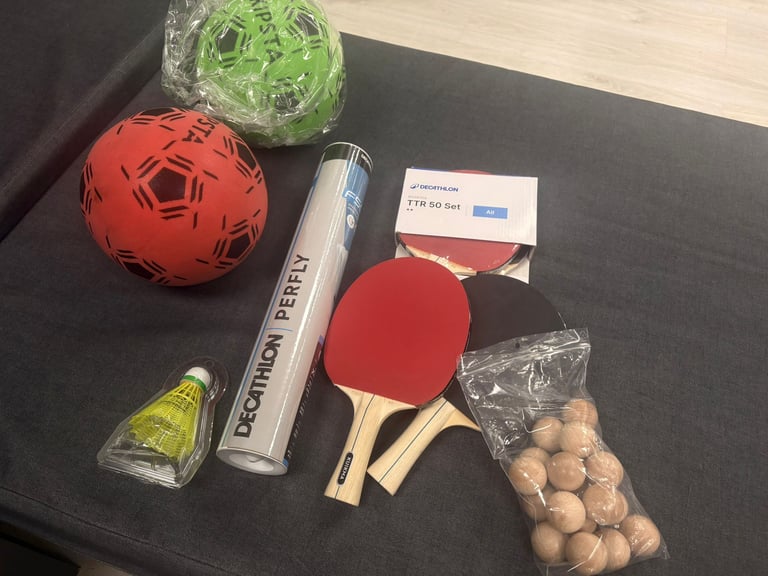 Material deportivo para actividades y torneos: palas de ping-pong, redes, pelotas, un pack de bádminton con red portátil, raquetas y volantes, pelotas de gomaespuma, aros, entre otros.