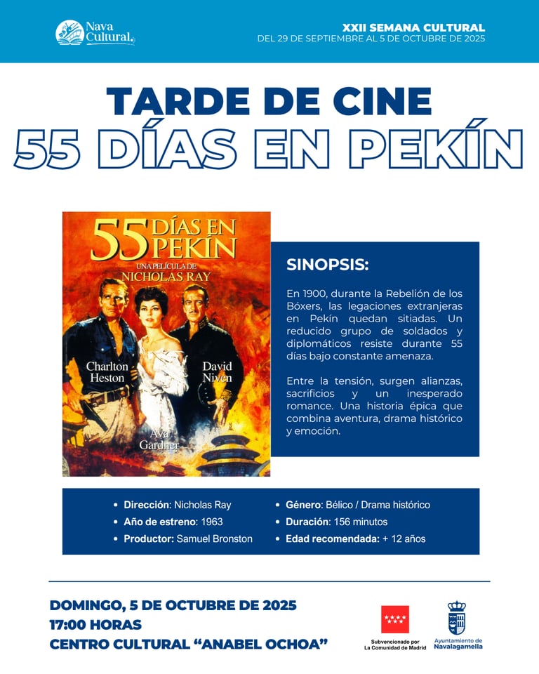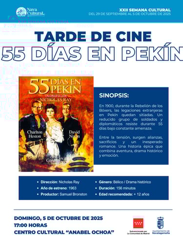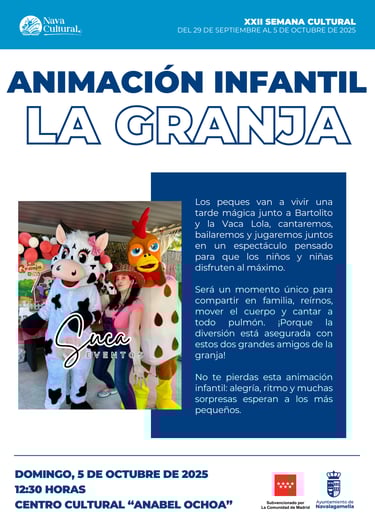 El domingo 5 de octubre estará dedicado de nuevo a los niños y niñas con el espectáculo “La Granja”, donde personajes tan entrañables como Bartolito y la Vaca Lola harán cantar, bailar y jugar al público infantil. Como broche final, la Semana Cultural se despedirá con la proyección del clásico cinematográfico “55 días en Pekín”, una obra maestra del cine bélico e histórico dirigida por Nicholas Ray en 1963.