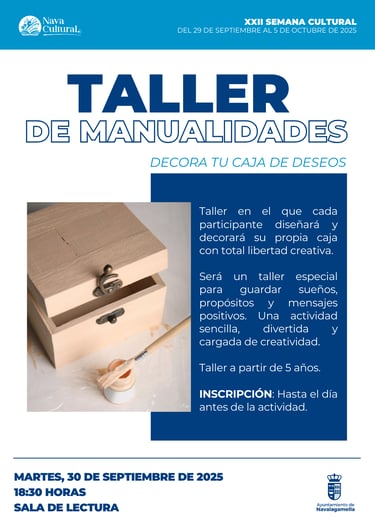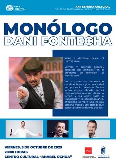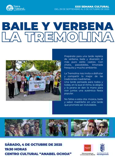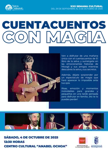 Del 29 de septiembre al 5 de octubre de 2025, Navalagamella celebra la XXII Semana Cultural de la Villa de Navalagamella, una cita ya consolidada en el calendario municipal que llenará el Centro Cultural “Anabel Ochoa” de actividades para todas las edades. Durante siete días, vecinos y visitantes podrán disfrutar de propuestas tan variadas como talleres, humor, música, cuentacuentos, animación infantil y cine, en un ambiente pensado para compartir en familia.